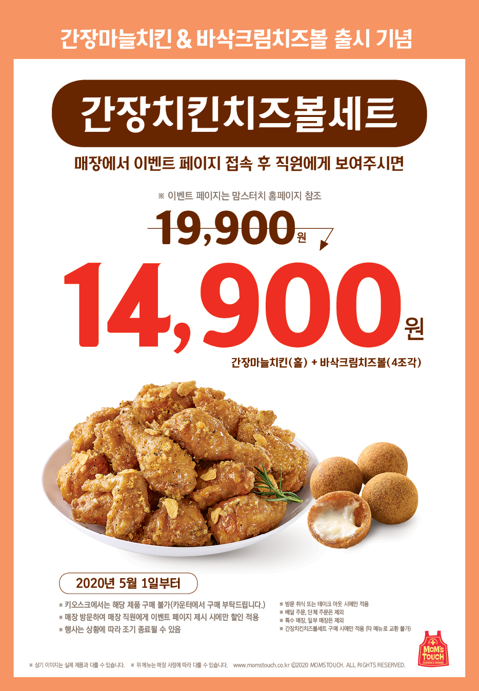 19,900원 짜리 간장마늘치킨치즈볼세트가 14,900원에 할인 판매하고 있어요!! 날짜는 20년 5월 1일부터이고