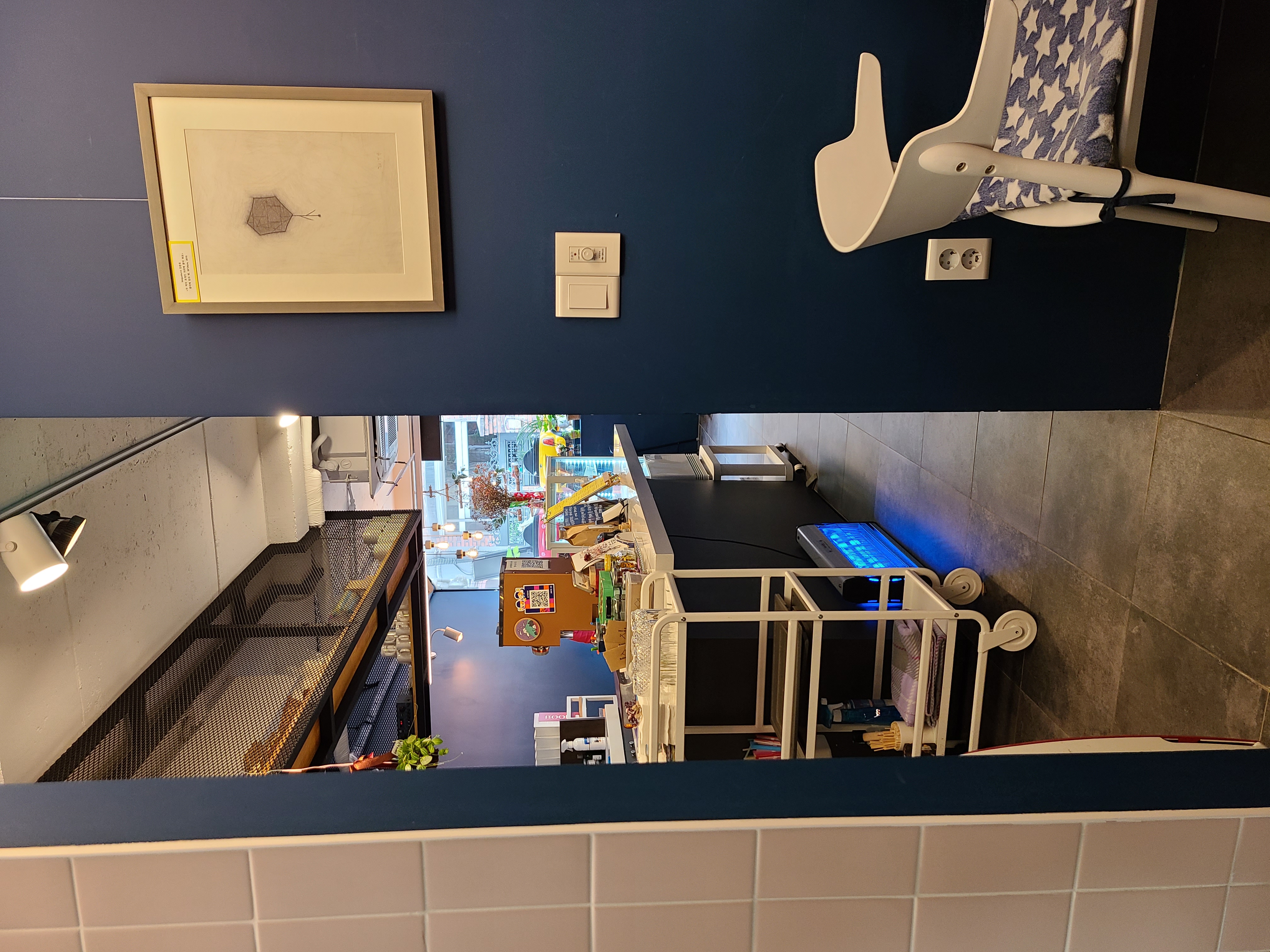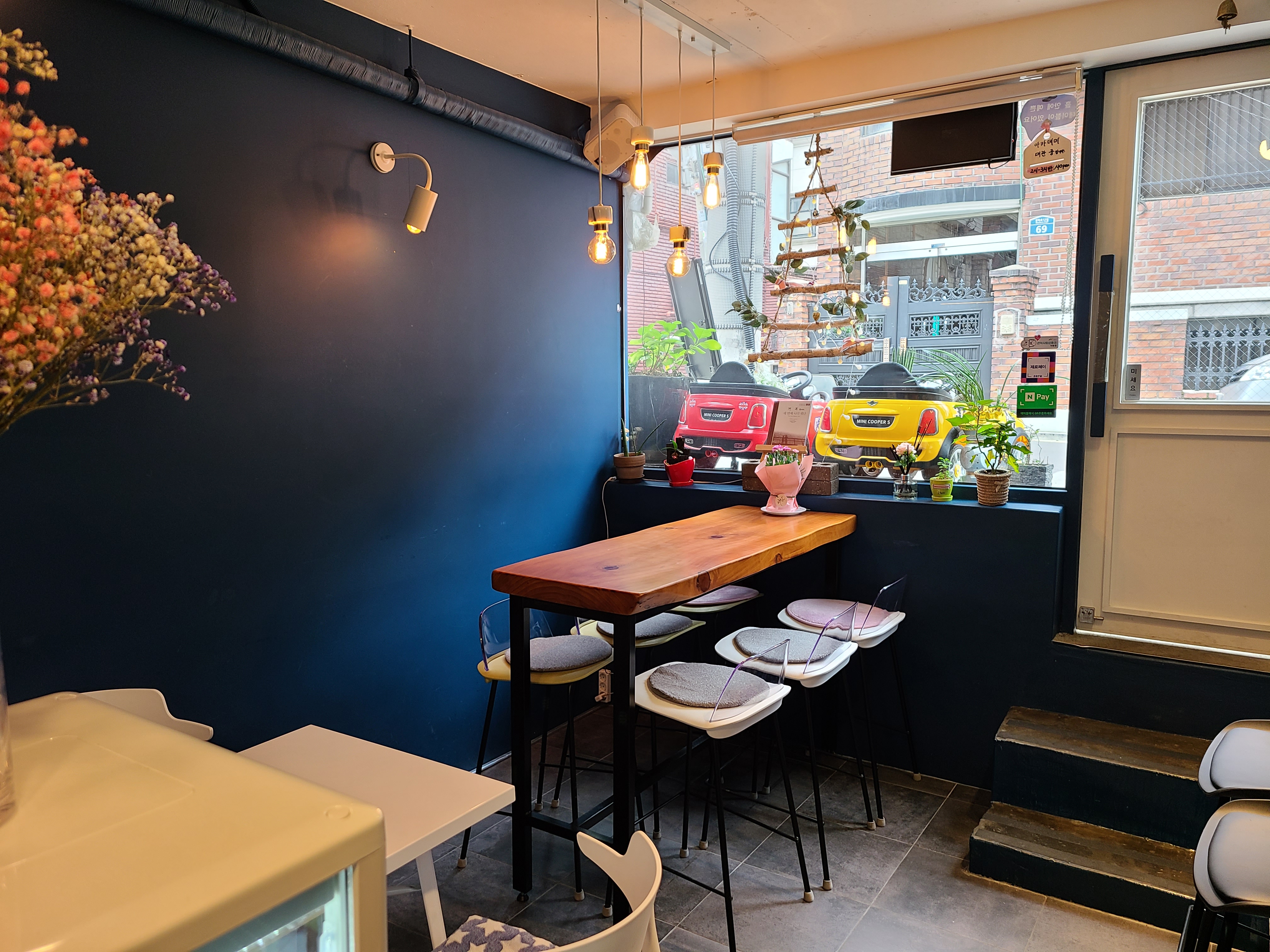 블루톤 벽과 노을빛 등이 잘 어울리는 실내입니다 ㅋㅋ 테이블이 많지 않아 조용하게 차 한잔 하면서 친구와 도란도란 얘기를 나누는 맛이 있을 것 같은 인테리어예요!