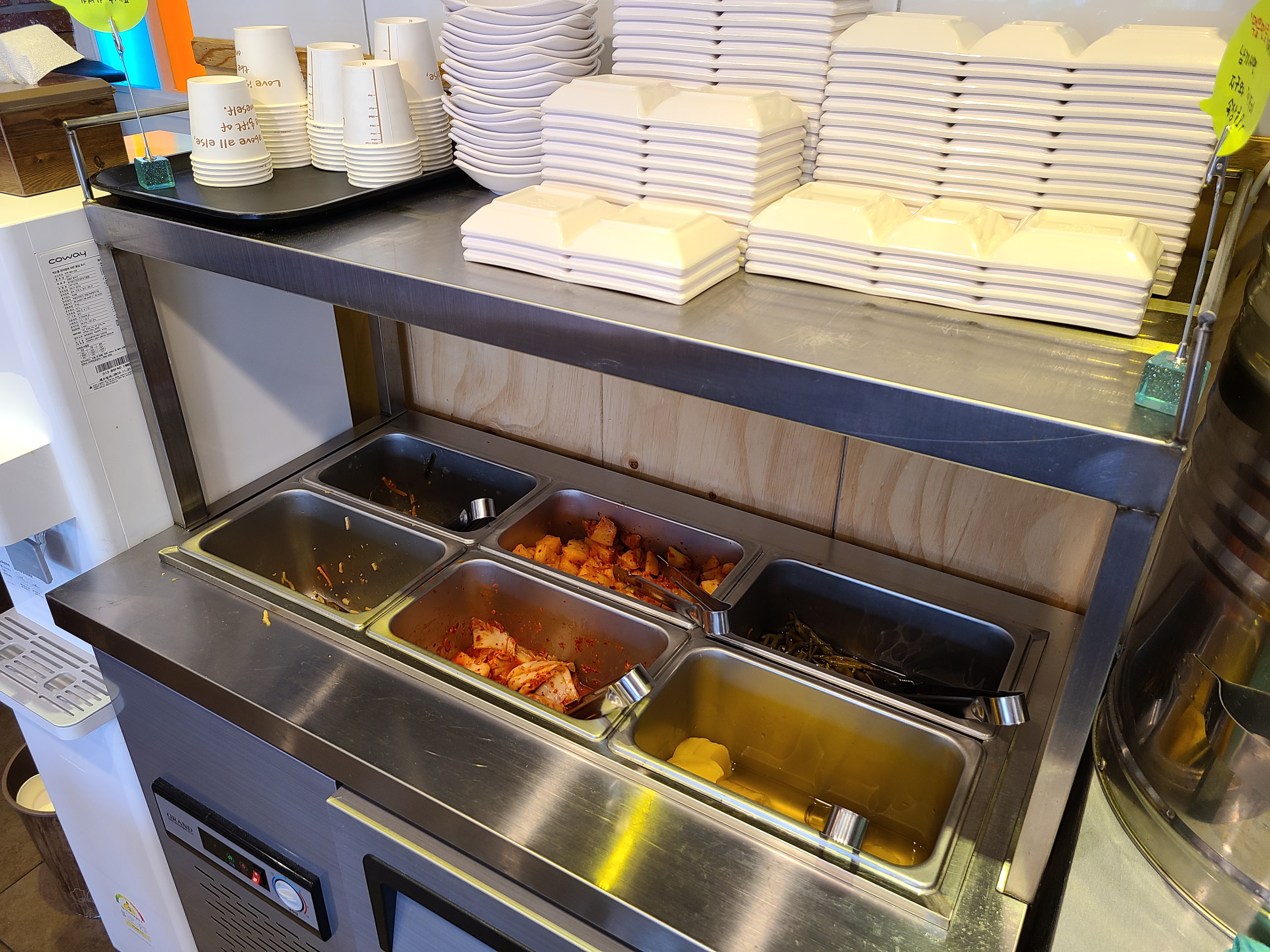 주문을 마치자마자 바로 셀프 반찬대에 가서 반찬들을 챙겨 왔어요 ㅋㅋ 보통 이런 셀프서비스 반찬대 가면 김치랑 단무지만 있는 게 대다수인데 김치 깍두기 단무지 어묵 미역줄기까지 소소하지만 이런 반찬들이 있다는 게 좋더라고요!