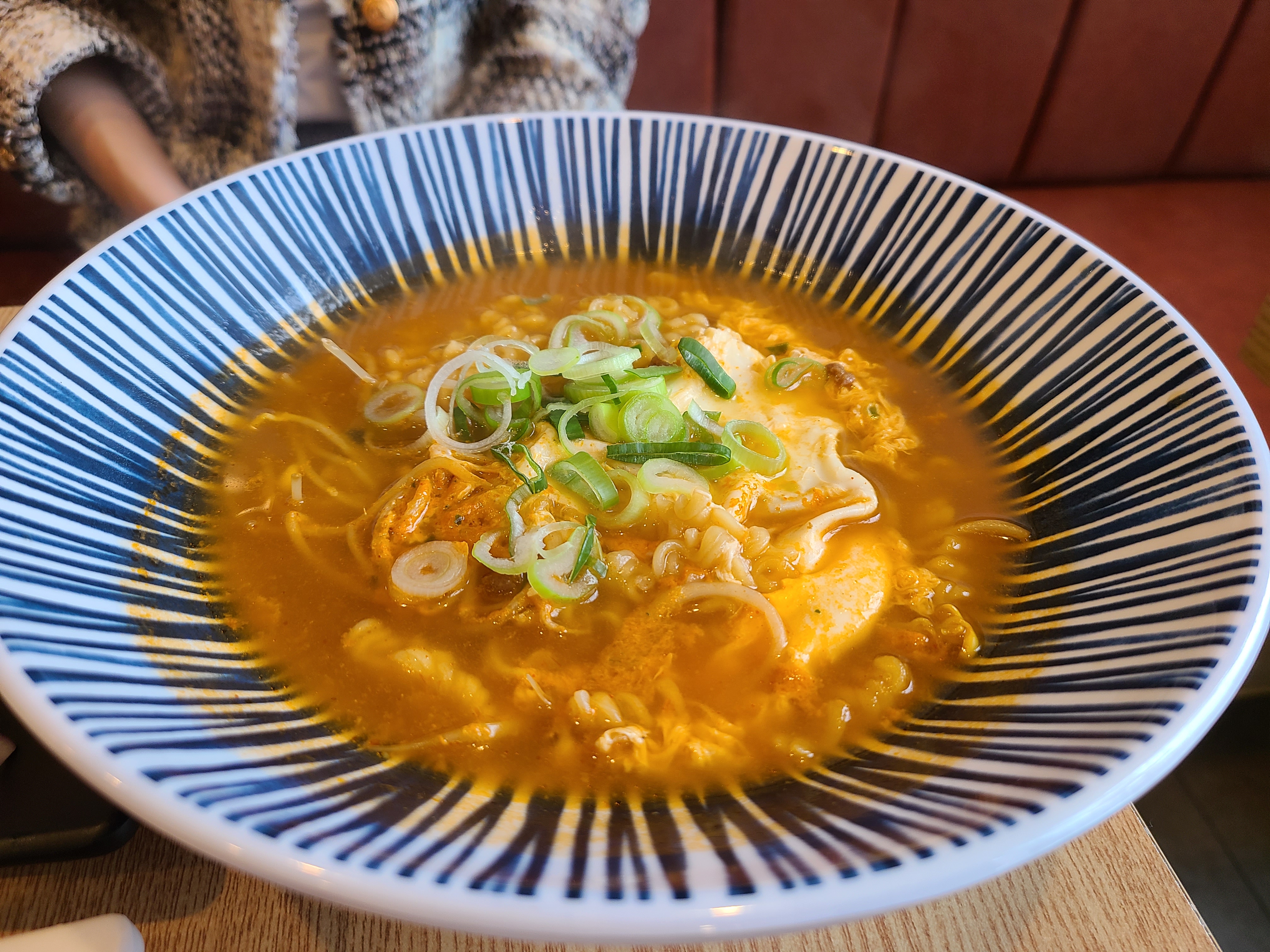 그리고 라면 + 돈까스 세트를 시켰는데요! 세트에 포함된 메뉴라 해서 쪼끔 맛보기 정도 주겠지 했는데... 웬걸 생각보다 커서 놀랐습니다! 제가 시킨 등심 돈까스에 반 이상 되는 크기더라고요... 그리고 라면은 진라면 매운맛으로 끓여주시는 거 같더라고요.. 저 멀리 주방에 있는 라면 봉지에 색이 그렇게 보이더라고요! 파랑 계란도 올라가 있어 너무 좋았어요!