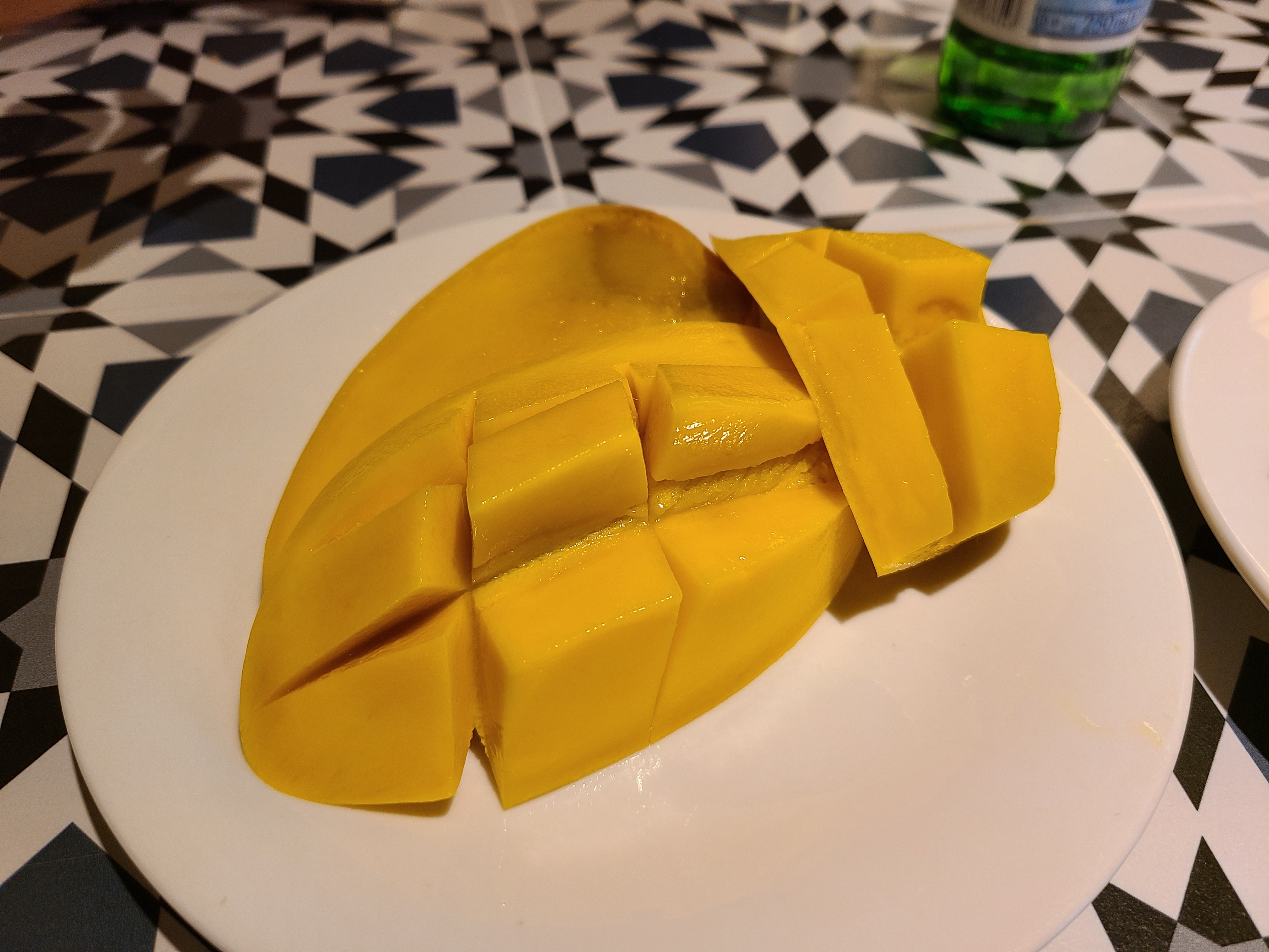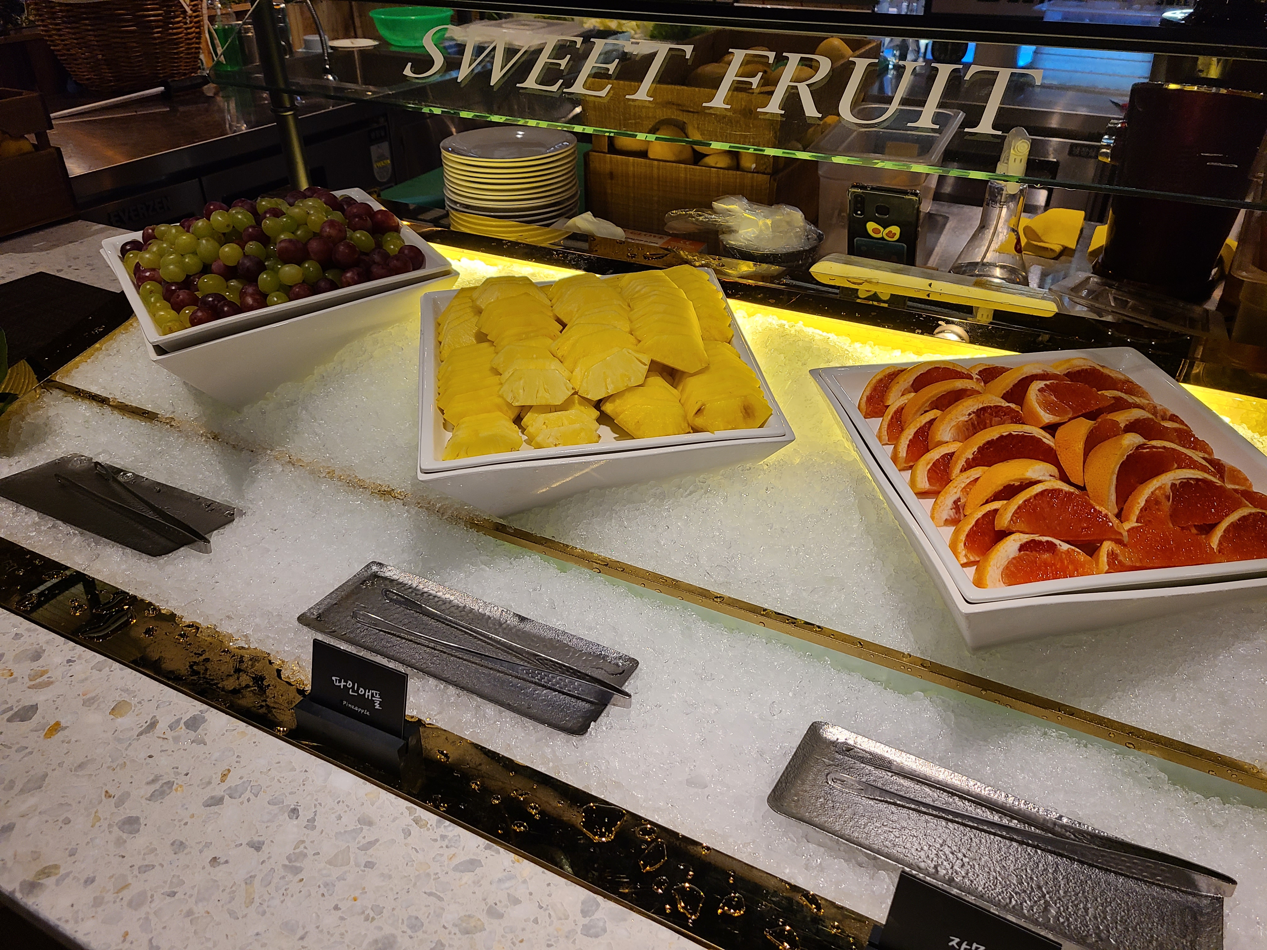 과일은 포도 자몽 파인애플 망고가 있었어요. 망고는 먹기 좋게 그 자리에서 썰어주시더라고요! 망고 너무 달고 맛있었습니다.