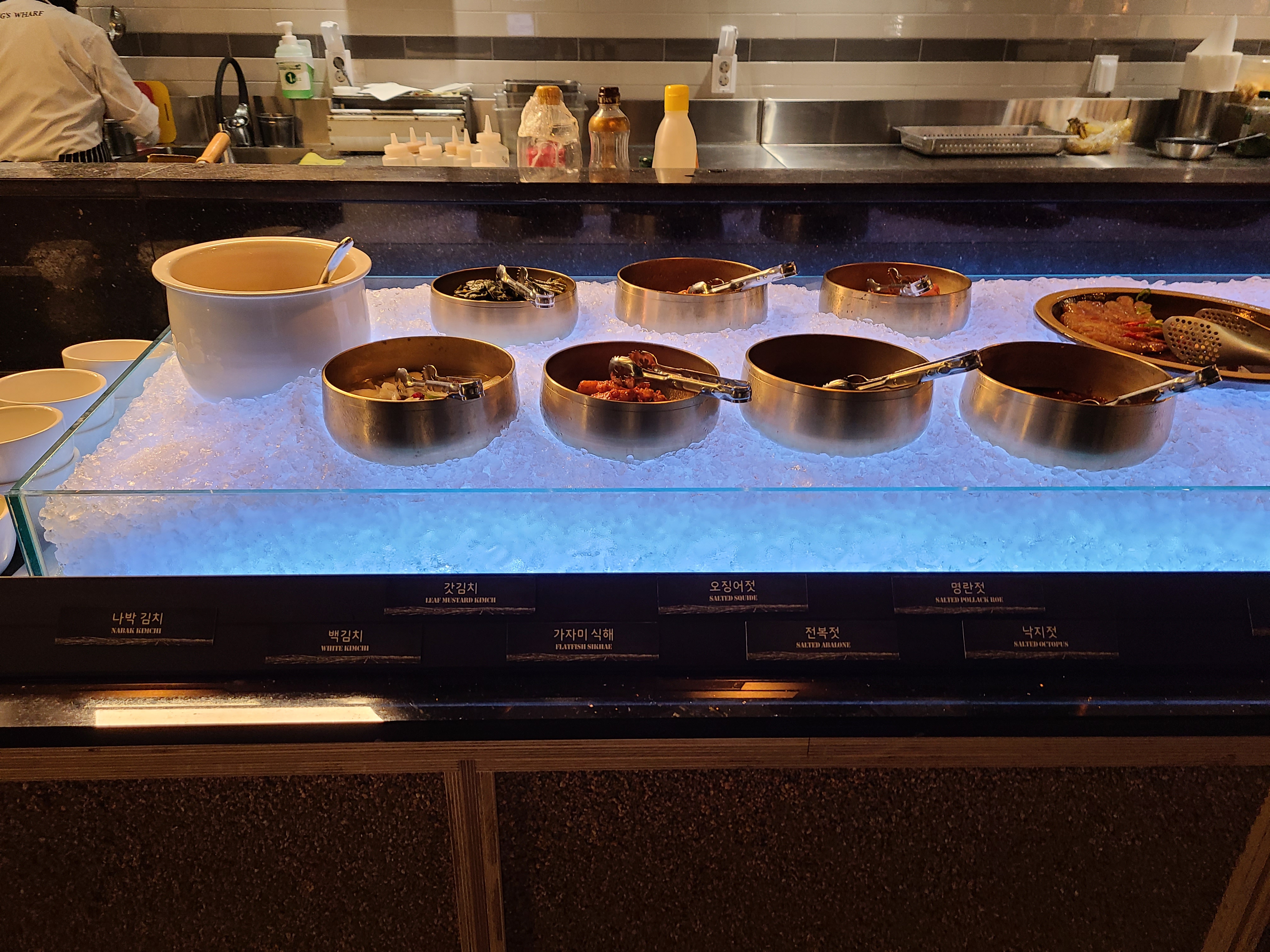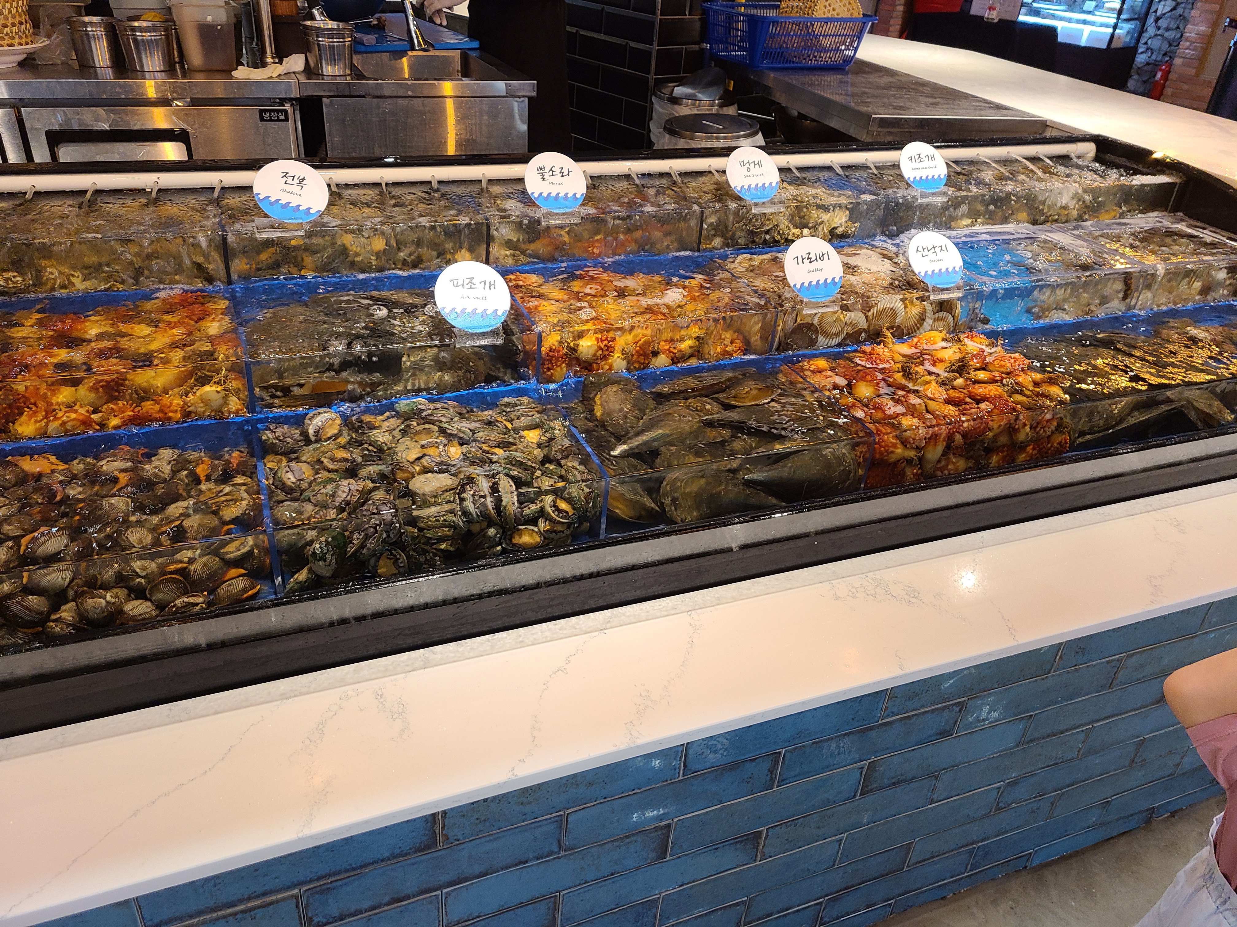 해산물 코너는 멍게 전복 각종 조개류 등이 있었어요!! 해산물 코너에 먼저 주문하며 테이블 번호를 얘기하면 해당 테이블로 직접 손질한 해산물을 가져다주는 시스템입니다.