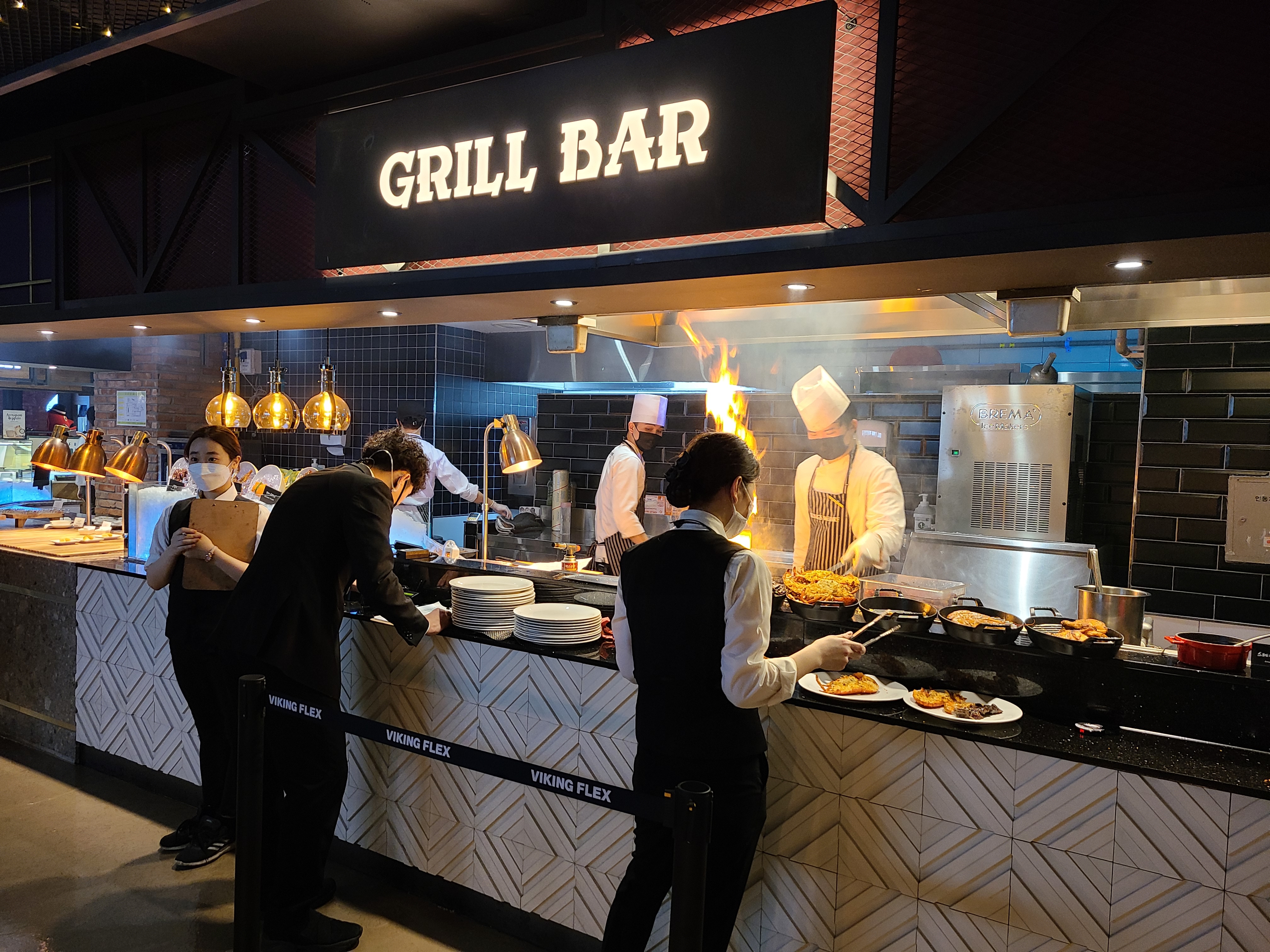 그릴바에요! 스테이크 갈비 새우 랍스터 등을 그릴에 구워 조리해주는 곳입니다. 이곳에서는 3가지 종류까지 선택이 가능하고 주문 후에는 진동벨로 알려줍니다. 진동벨이 울리면 찾아가는 시스템이에요.