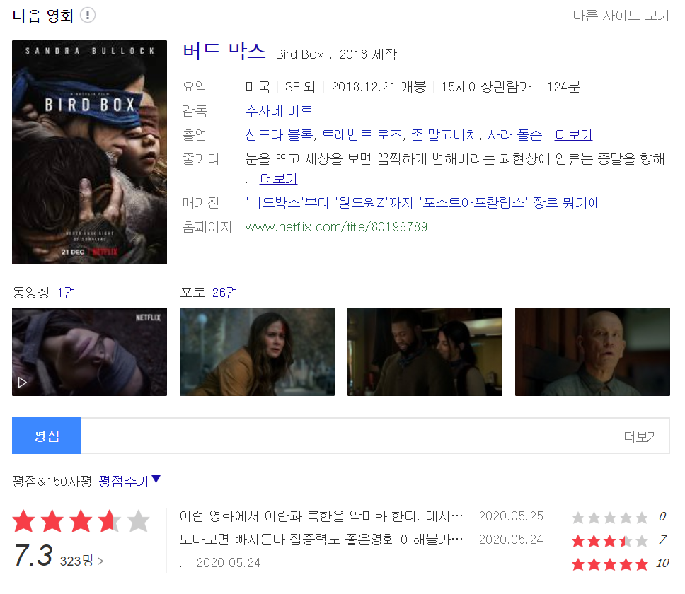 이 영화는 넷플릭스에서 개봉과 동시에 4500만 뷰를 찍었다고 합니다. 엄청난 스코어죠 영화 내내 그것에 대한 정체는 나오지 않지만 산드라 블록의 연기와 공포로 몰아가는 방법은 감독의 훌륭한 역량이 보이는 작품이었습니다.