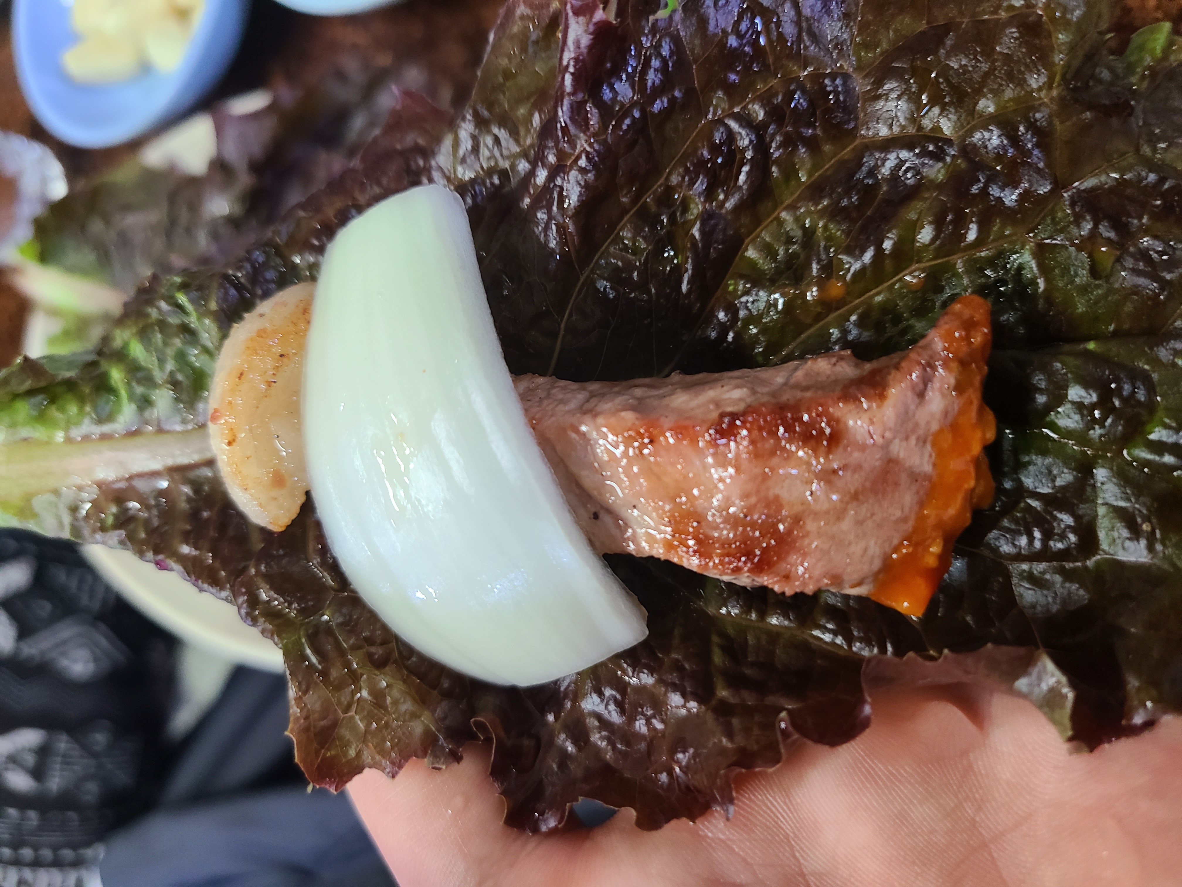 잘 익은 고기에 쌈장 올리고 양파와 마늘 한점 올리면 정말 끝장나죠!!ㅋㅋ