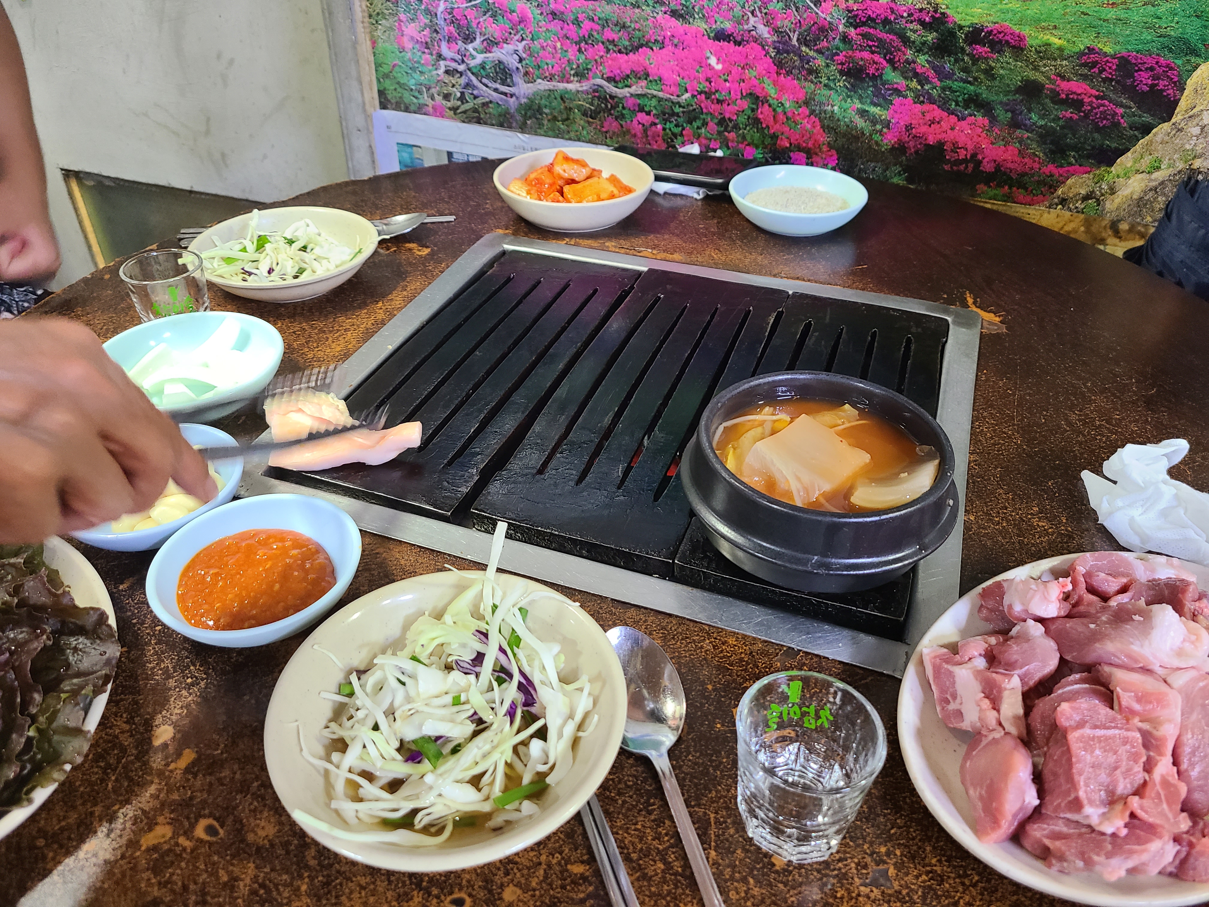 저희는 덩어리 생고기 2인분과 소주를 주문했어요!! 초간장 소스가 들어간 양배추와 선지가 들어간 김칫국 양파 쌈장 소금 후추가 나왔죠!! 무쇠로 된 철판이 달궈지자 돼지비계로 기름칠을 쫙해주시더라고요!!