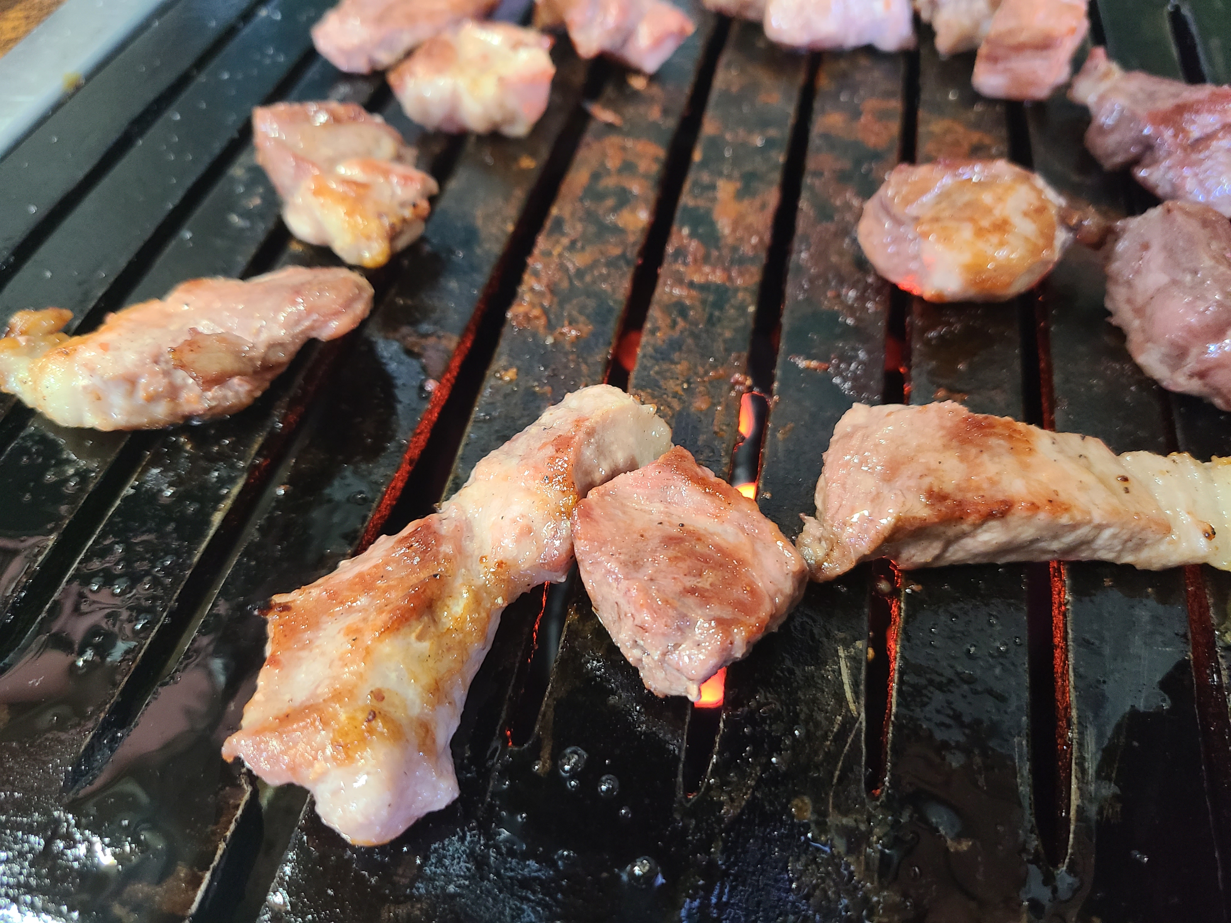 무쇠 철판이라 충분히 달궈지고 나니 고기가 늘러 붙지도 않고 맛있게 잘 익더라고요! 그리고 아까 입구에서 봤던 연탄으로 불을 하는데 화력이 너무 쌔지도 약하지도 딱 좋게 익어가는 느낌이었습니다!!