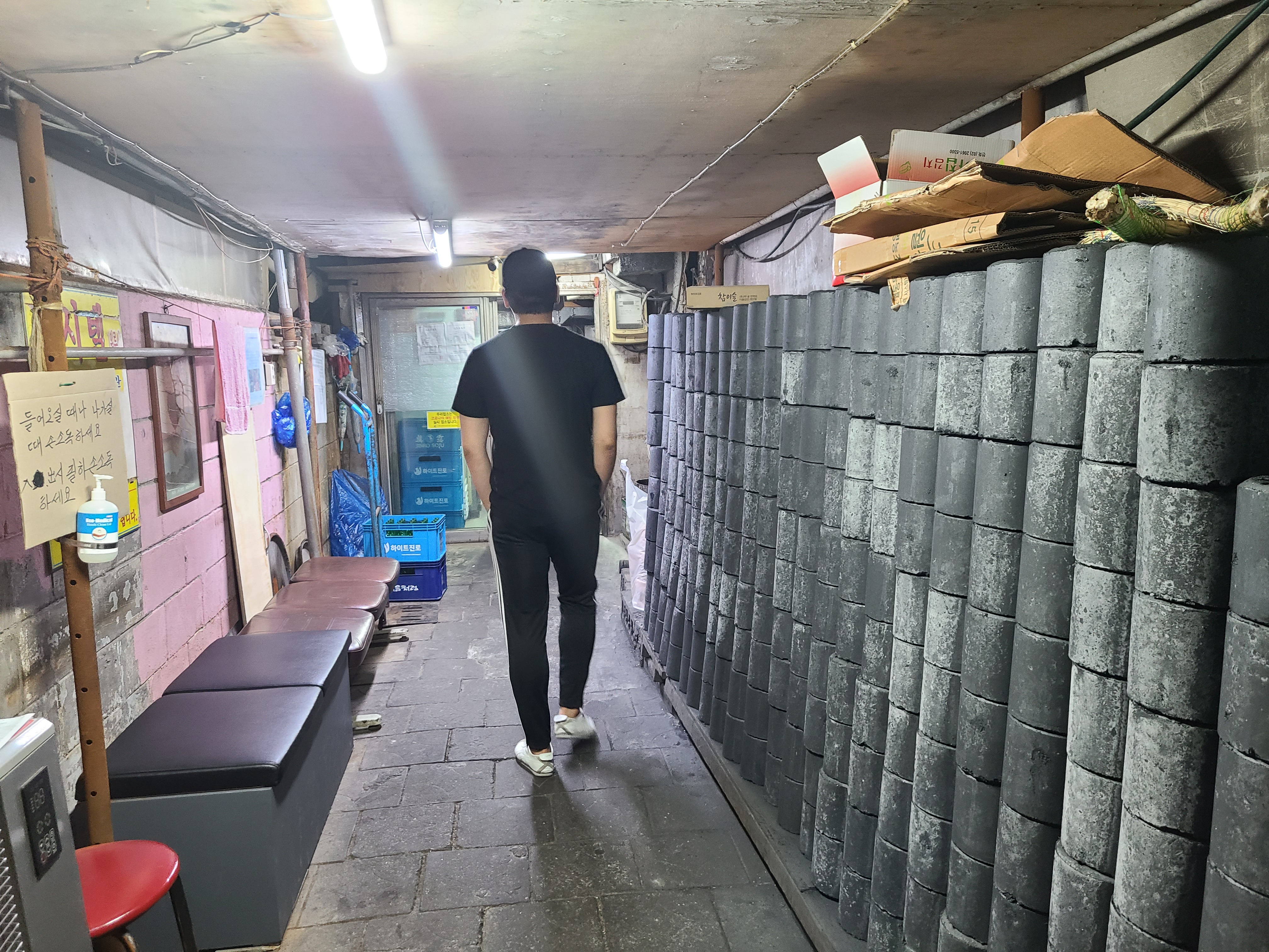 간판을 지나면 바로 옆으로 연탄이 쭉 깔려있고 웨이팅 전용 좌석이 보입니다. 정보가 없이 찾아가본 가게라 몰랐는데 워낙 유명한 가게이고 연탄으로 고기를 굽는 가게이더라고요!!