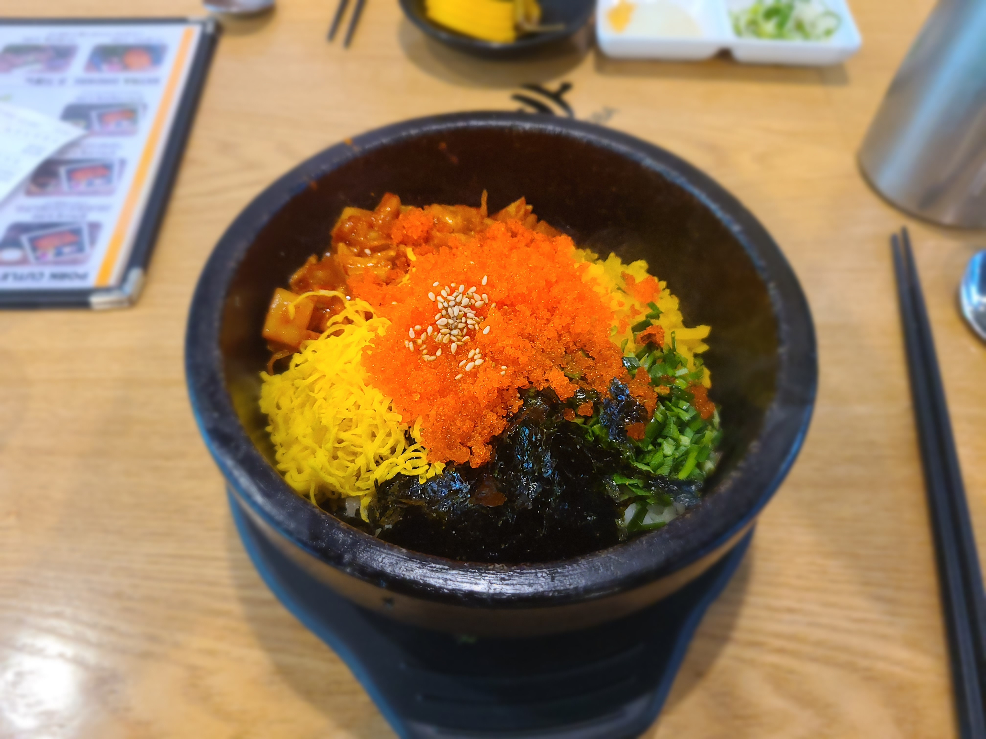 알밥이 나왔어요!! 돌솥이 매우 뜨거우니까 조심하셔야 해요!! 밥이 지글지글 돌솥에 익어지는 소리가 나고 알이 생각보다 많이 들어있어 좋았습니다!! 하지만 생각보다 매웠어요!! 비비면서 매운 내가 코를 찔러 놀랐습니다. 매운걸 잘 못 먹는 사람 기준으로 맵다는 거지 엄청 매운 정도는 아니니까 염려하지는 마세요!!