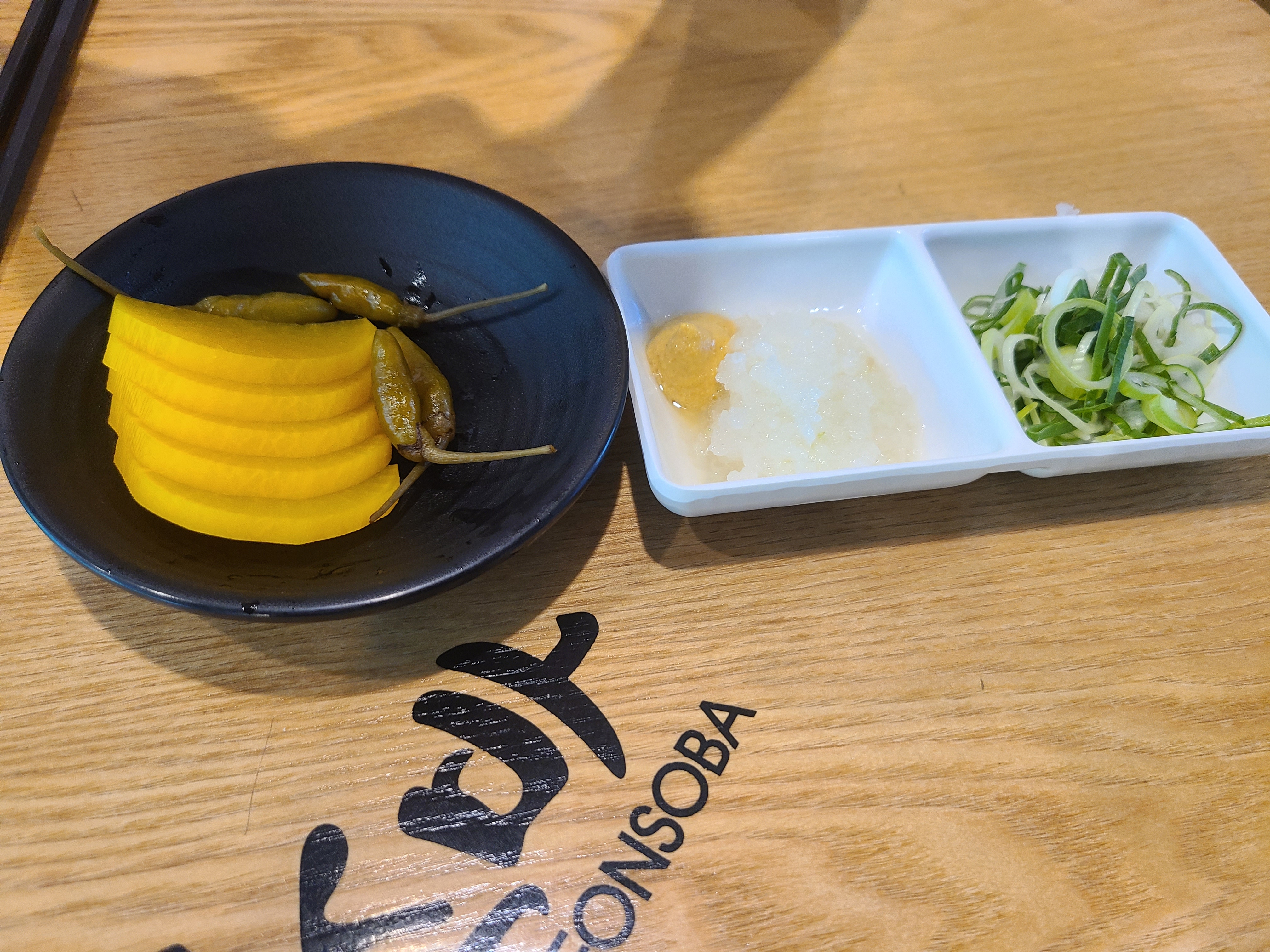 단무지와 고추장아찌가 담겨있고 판 메밀 국물에 넣을 무와 겨자, 대파가 나왔습니다!! 반찬 종류는 셀프 코너에 가시면 직접 가져다 드실 수 있어요!!