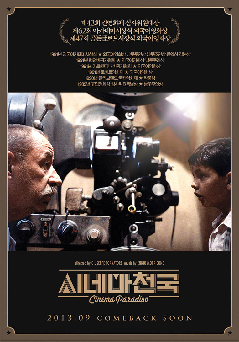 시네마 천국은 1988년에 개봉한 영화로 62회 미국 아카데미 시상식(외국어영화상), 11회 청룡영화상(외국영화상), 47회 골든 글로브 시상식(외국어 영화상), 42회 칸영화제(심사위원대상), 11회 런던 비평가 협회상(외국어영화상, 남우주연상), 44회 영국 아카데미 시상식(남우주연상, 남우조연상, 각본상, 외국어영화상, 안소니 아스퀴스상), 2회 유럽영화상(심사위원특별상) 헤아리기 힘들정도로 많은 상을 수상한 작품인데요.
